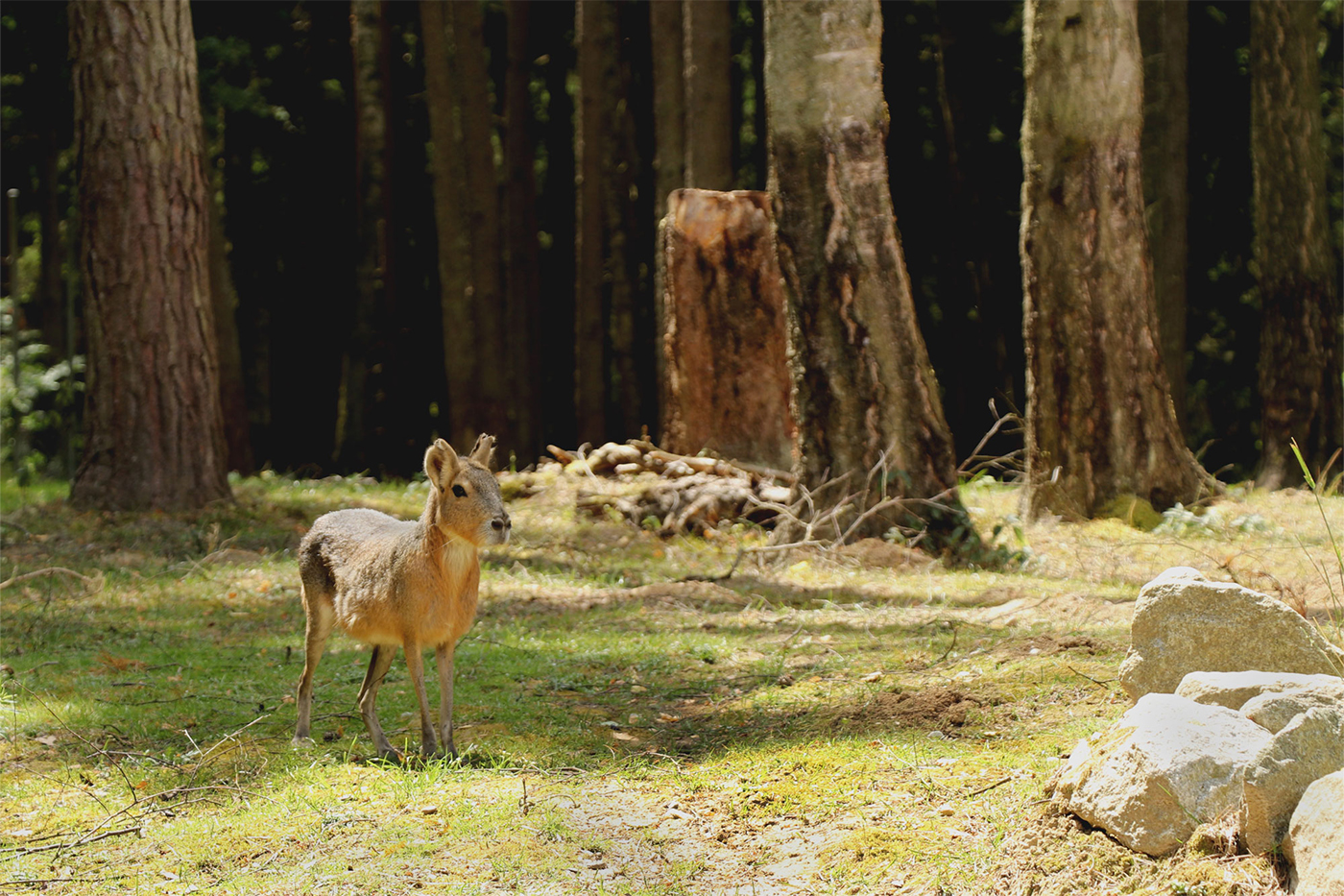 Pampashasen oder auch Maras genannt sind eine Unterfamilie der Meerschweinchen in der Ordnung der Nagetiere. Sie sind opportunistische Pflanzenfresser. Zur besseren Verwertung der Nahrung praktizieren sie die Caecotrophie, das nochmalige Verzehren des Kotes. Maras leben streng monogam. Die Weibchen sind nur alle 3 - 4 Monate für ca. eine halbe Stunde empfängnisbereit. Maras sind als gering gefährdet eingestuft. Sie können 10 bis 15 Jahre alt werden und wiegen zwischen 8 und 15 Kilogramm, wobei die Weibchen etwas schwerer werden als die Männchen. Bei uns teilen sie sich das Gehege mit den Wallabys gegenüber der Rundbootfahrt durch Schloss und Grotte. Sie lieben ihr Territorium, welches aus Bäumen, Lichtungen, Unterständen und einer Hütte besteht. An sonnigen Tagen liegen sie gerne beim Sonnen und auch so zeigen sich die tagaktiven Pampashasen gerne. Als Pflanzenfresser mögen unsere Pampashasen gerne Gras, Zweige sowie Obst und Gemüse, was einen besonderen Leckerbissen darstellt.