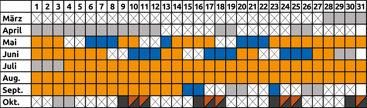X: Der Bayern-Park ist an Tagen, die mit „X" gekennzeichnet sind, geschlossen.